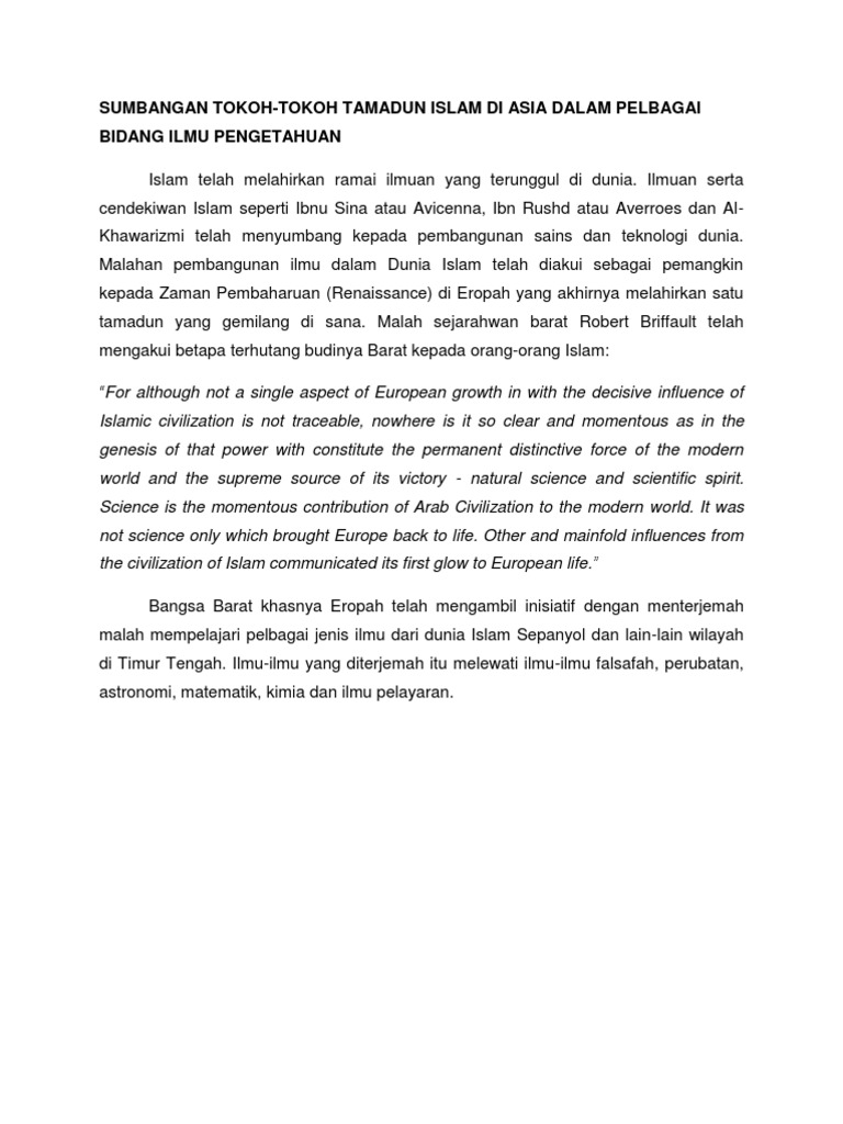 Sumbangan tokoh tokoh islam. Sesi pengajaran pidato jawatan yg disandang hasil karya. 2 0 ibnu sina bapa sejarah sains 2 1 latar belakang avicenna adalah satu nama yang sentiasa meniti dibibir bibir masyarakat barat di eropah. Tokoh tokoh tamadun islam dan sumbangannya 1. Dalam kajian ini akan membicarakan beberapa orang tokoh sarjana perubatan islam yang agung yang banyak memberi sumbangan dalam perkembangan islam seperti ibnu sina abu qasim al zahrawi dan al razi.