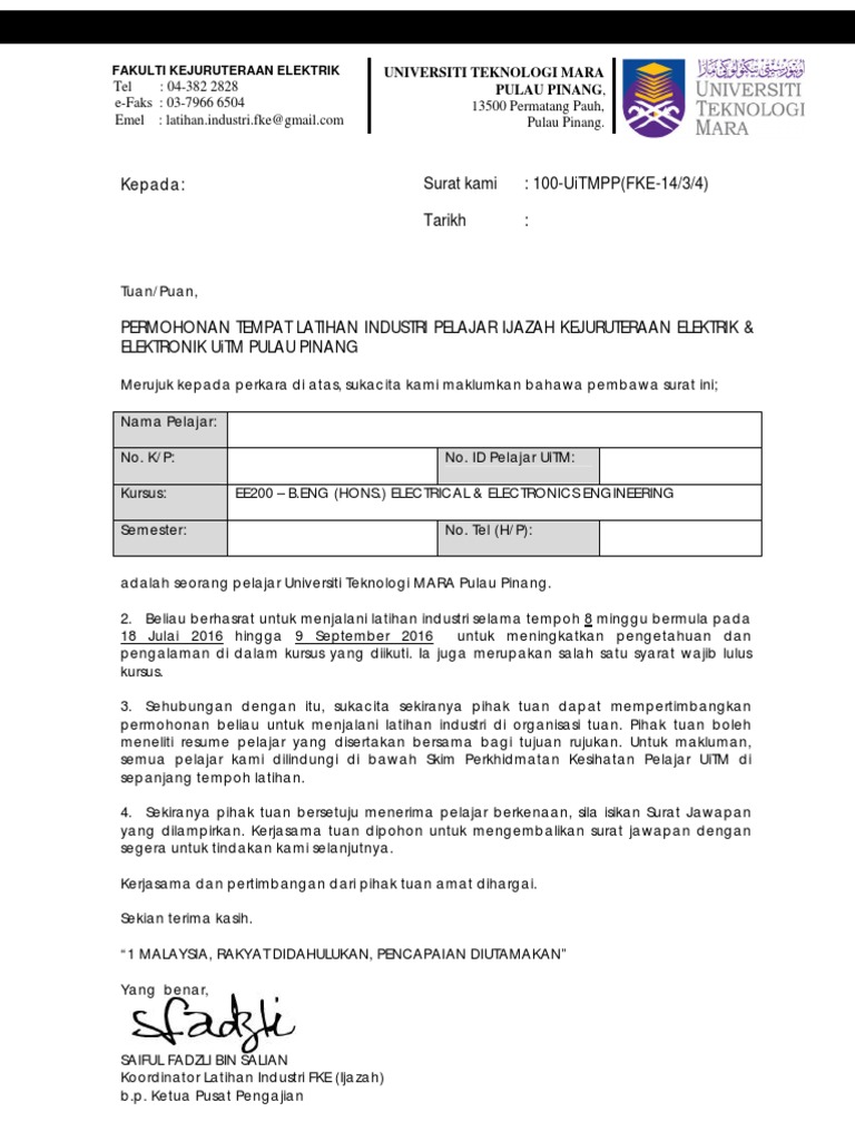 Surat Permohonan Latihan Industri Pelajar Faculty Of Management And Information Technology Usas فيسبوك