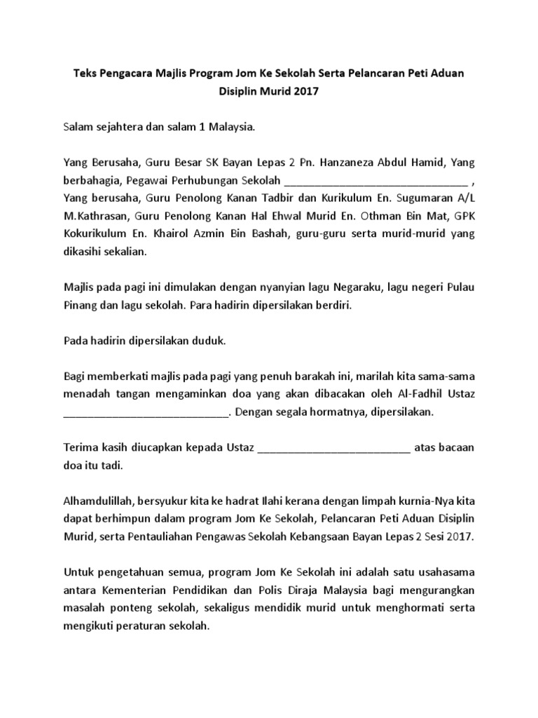 Teks Pengacara Majlis Program Jom Ke Sekolah Serta Pelancaran Peti Aduan Disiplin Murid 2017
