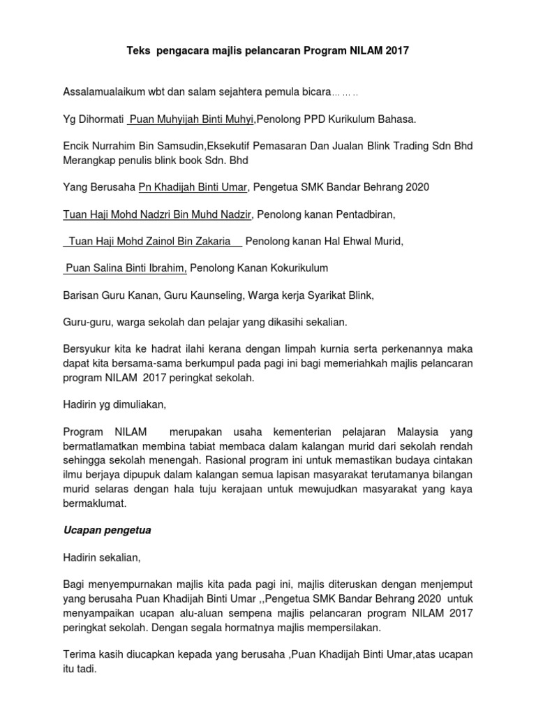 Teks Pengacara Majlis Pelancaran Program Nilam 2018