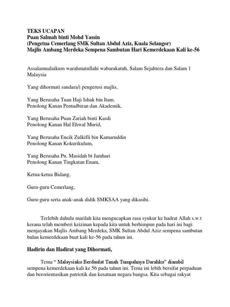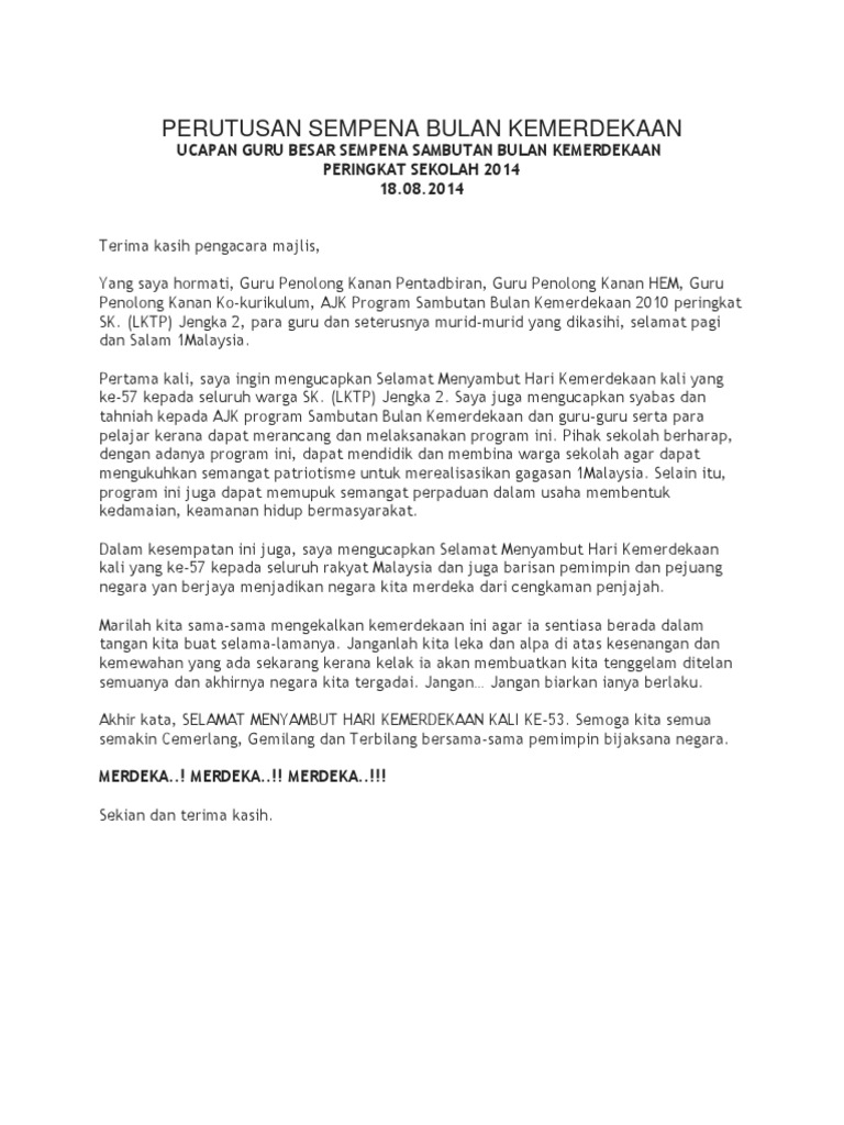 Teks Sambutan Hari Kemerdekaan Peringkat Sekolah
