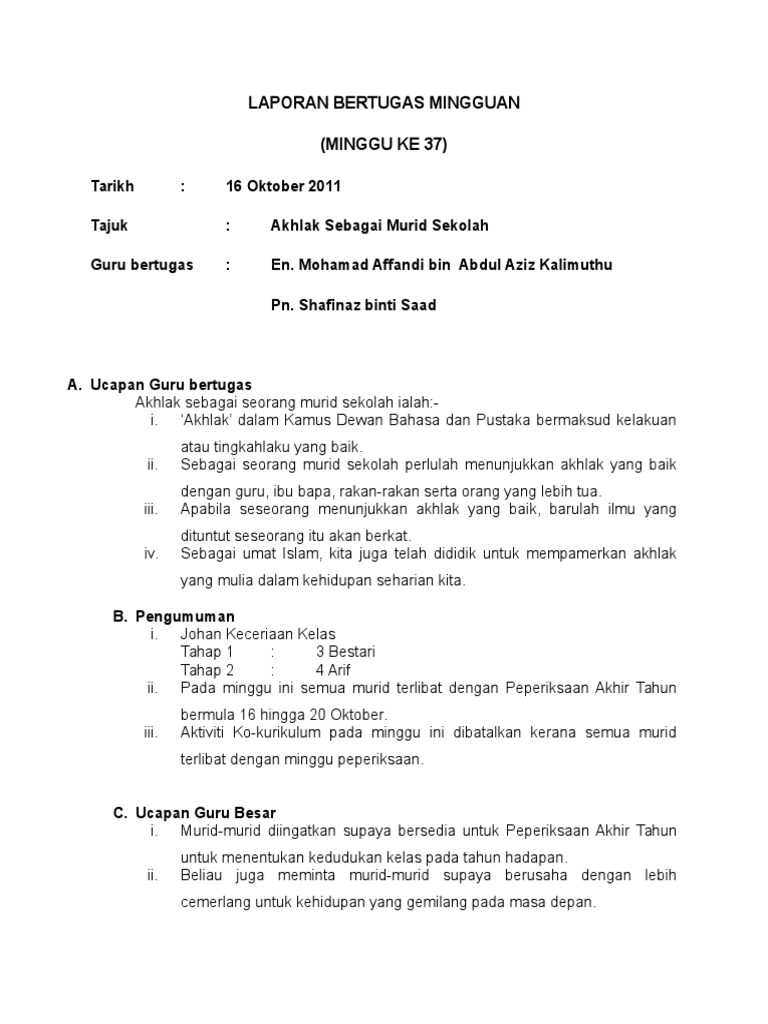 Teks Ucapan Laporan Guru Bertugas Mingguan Smkds