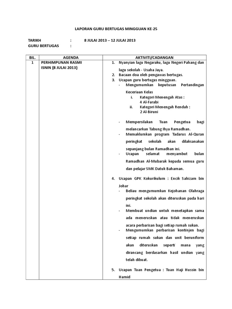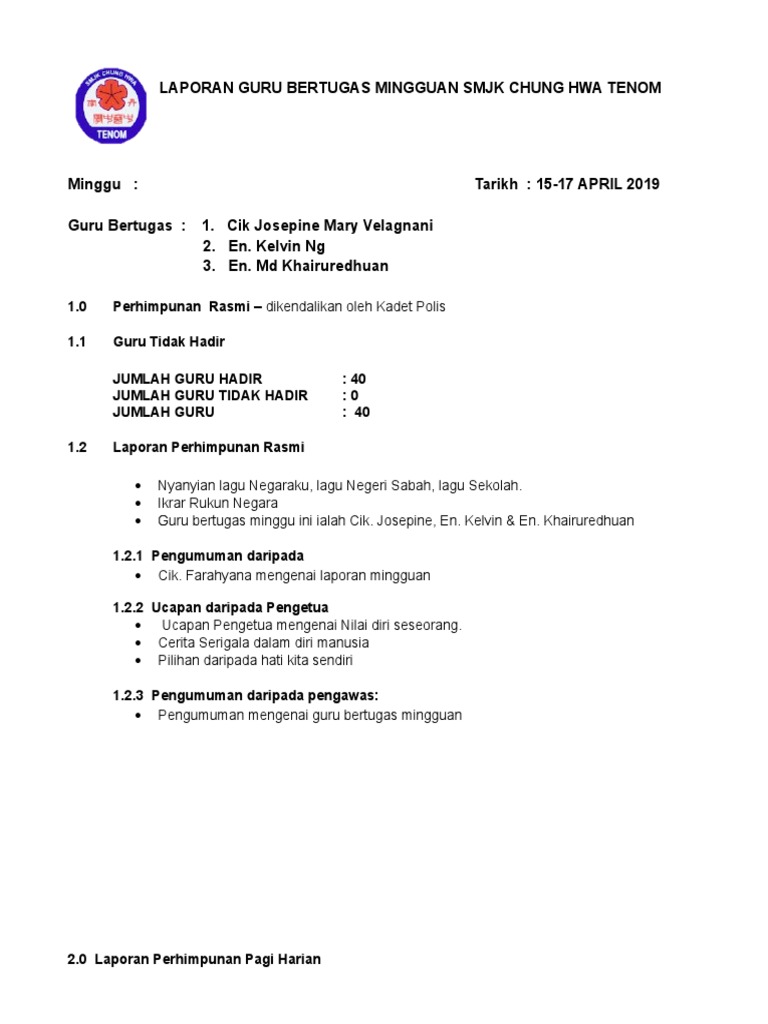 Format Laporan Guru Bertugas Mingguan 2019 New