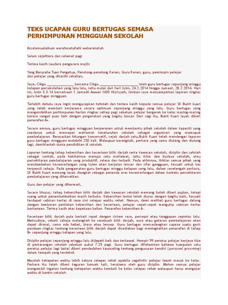 Teks Ucapan Guru Bertugas Semasa Perhimpunan Mingguan Sekolah