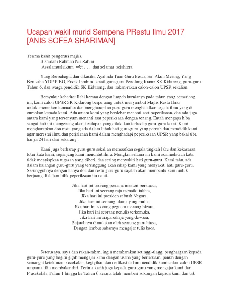 Ucapan Wakil Murid Majlis Restu Ilmu Assalamualaikum Wbt Dan Selamat Sejahtera Sejambak Kasih Titipan Sayang Buattuan Text