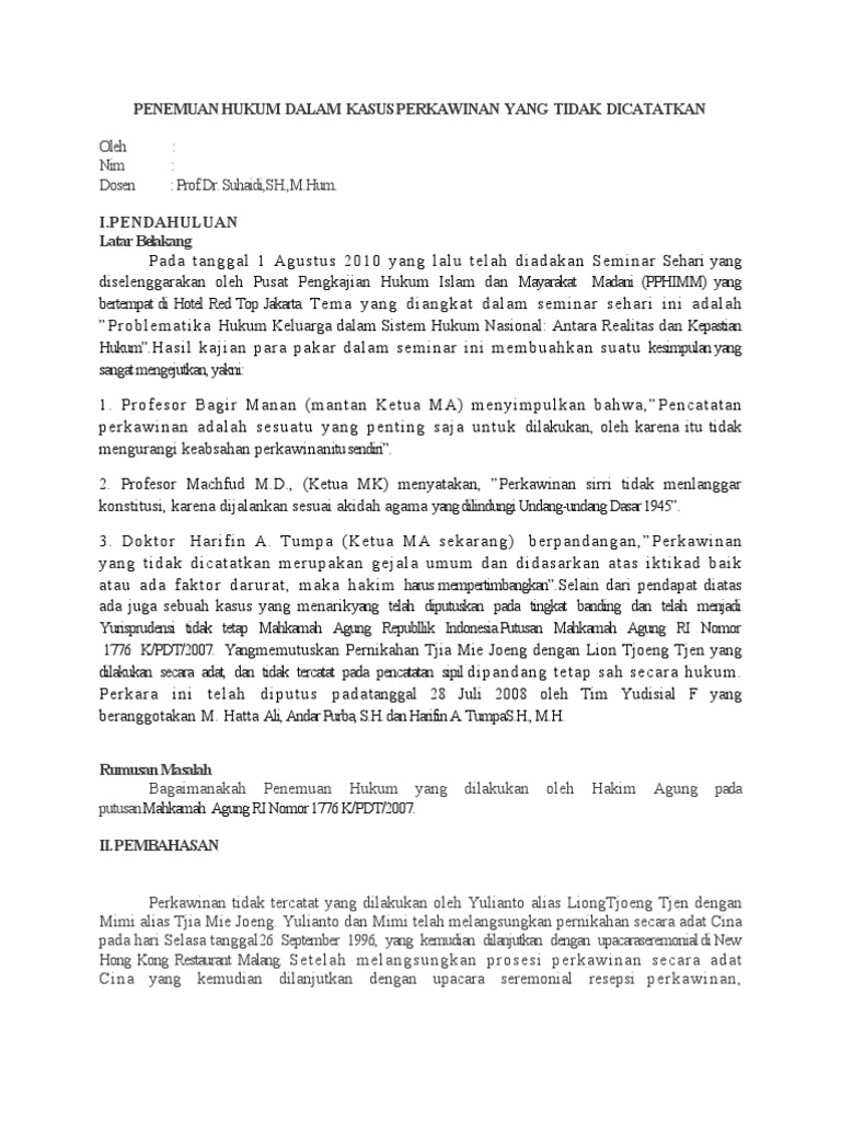 Penemuan Hukum Dalam Kasusperkawinan Yang Tidak Dicatatkan