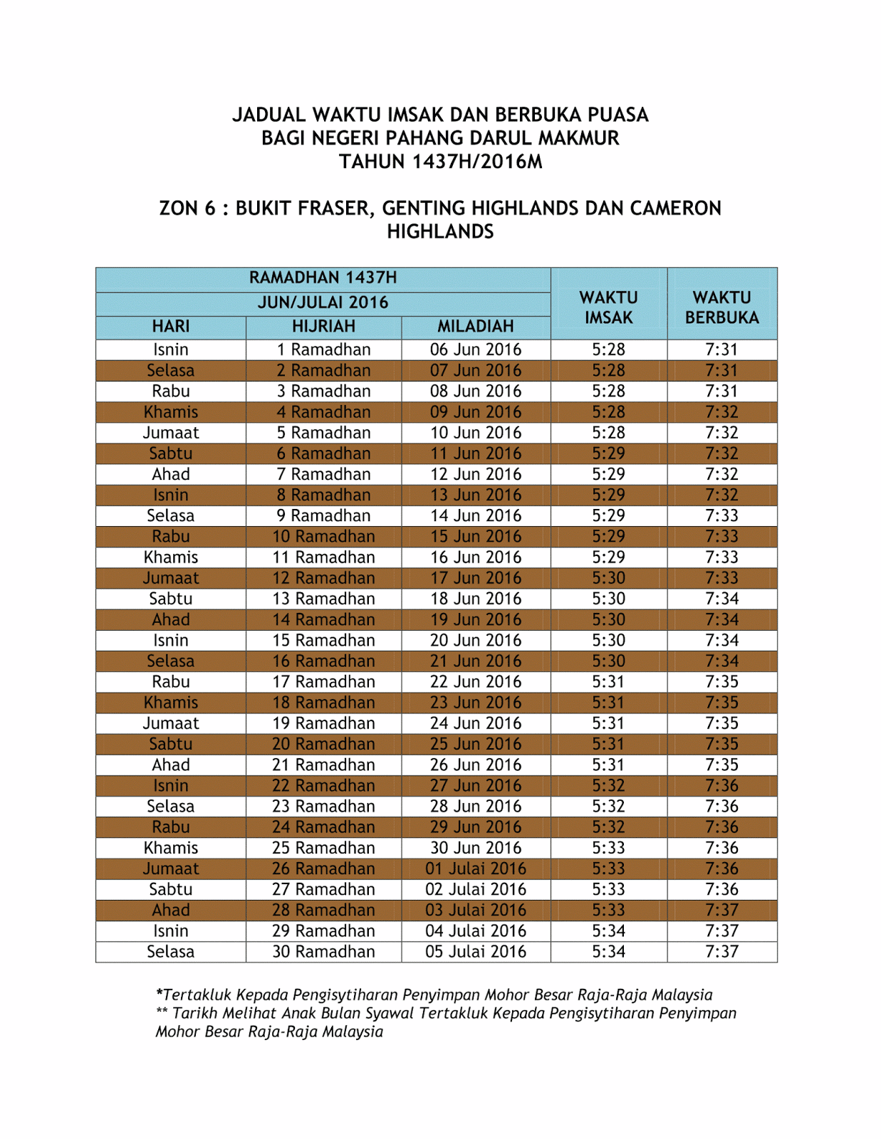 Waktu berbuka puasa 2019 pahang. Waktu berbuka puasa dan imsak tahun 2019 bagi zon phg06 cameron highlands genting higlands bukit fraser puasa adalah ibadat yang memupuk kesuburan rohani dan jasmani juga sebagai latihan bagi diri dan jiwa untuk melentur nafsu agar tidak melampui batas. Penyusunan waktu solat fardhu telah diajarkan sendiri oleh malaikat jibrail kepada nabi muhammad s a w. Jadual waktu buka puasa dan imsak ramadhan 2020 negeri pahang semoga lampiran jadual waktu imsak dan berbuka puasa bulan ramadhan tahun 1441h 2020m yang disertakan dapat memudahkan umat islam di negeri pahang membuat semakan masa yang ideal untuk bersahur sebelum memasuki waktu subuh selain dapat berbuka puasa pada waktu yang tepat. Puasa secara bahasanya boleh diertikan sebagai menahan diri.