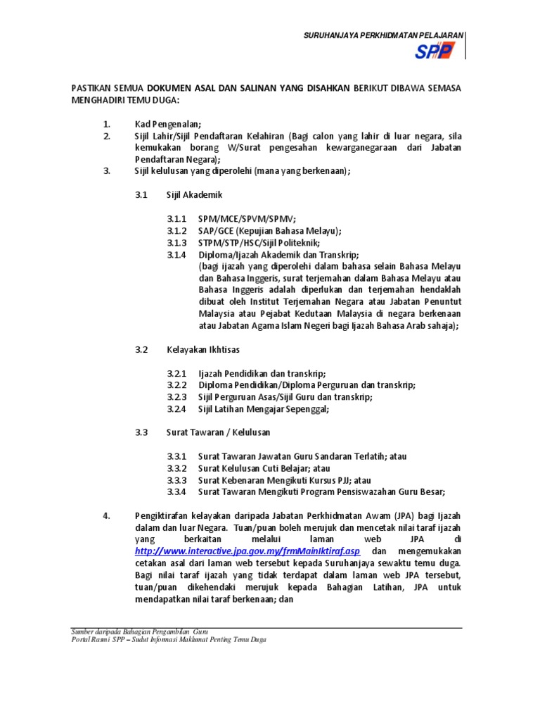 Senarai Semak Dokumen Peribadi Bagi Temuduga Spp